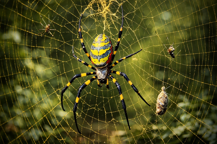 One of the easiest ways to recognize a Joro spider is by its bold and vibrant coloration. The females, which are significantly larger than males, display a striking combination of yellow, blue, and black patterns across their bodies. Their long legs feature alternating bands, giving them a dramatic, almost ornamental appearance.